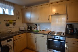 Window to side. Selection of base and eye level units in beech effect. Dark grey laminate worktop. Built in oven and hob. Plumbing for washing machine.