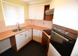 Tiled floor. Spotlights. Selection of base and eye level units. Wood effect laminate worktop. Built in eye level oven. Built in hob. 1.5 stainless steel sink with drainer. Window to garden.