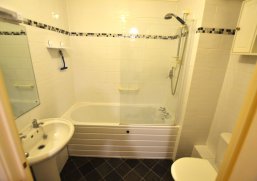 Vinyl flooring. White bath with shower fixture over taps, white wash basin with stainless steel taps, white low level flush w/c. Walls fully tiled to ceiling. Flush light. Electric fan heater. Electric extractor fan.