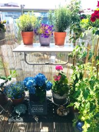 Balcony: glass sides, wooden base.