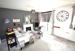 Deep piled carpet, 2 x pendant light fittings with shades, upvc french doors to balcony, upvc window to rear. Fireplace with flame effect electric fire. Wall-mounted energy efficient panel heater. Several floating wooden shelves. Picture rail.