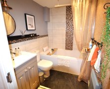 Double size recessed shower cubicle with rainwater shower. Low level flush wc with special back flush facility and built in cupboard with shelving behind. Built in wash hand basin with storage cupboard below. Heated towel rail. Silcotex textured featured wall in silver. Mosaic tiled wall above wash basin and wc. Water resistant vinyl laminate flooring. Ceiling recessed spotlights.