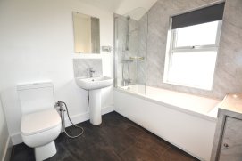 Tiled flooring. Window to rear. White sanitary ware including bath with shower over the taps, wash hand basin and low level flush w/c. Ceiling height waterproof wall boards around bath. Recessed spotlights.