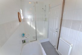 Window to garden. Bath with shower fixture over bath. Walk in shower cubicle. Wash basin. Low level flush wc. Floor laid to tiles.