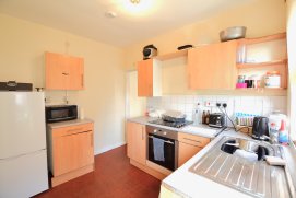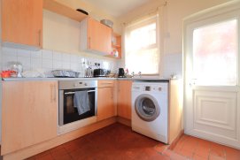 Window to garden. Base and eye level units. Built in oven and hob. Plumbing for washing machine. Tiled floor.
