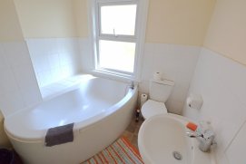 Window to garden. Corner bath. Wash hand basin. Low level flush w.c . Tiled floor.