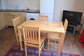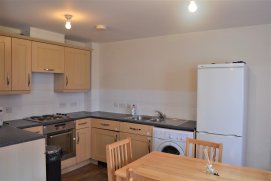 Kitchen has a selction of beech effect base and eye level units. Built in oven and hob. Stainless steel extractor hood. Housing and plumbing for washing machine.