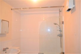 Built in shower cubicle, fully tiled, wash basin and low level flush w/c. Walls half tiled around wash basin. Vinyl flooring.